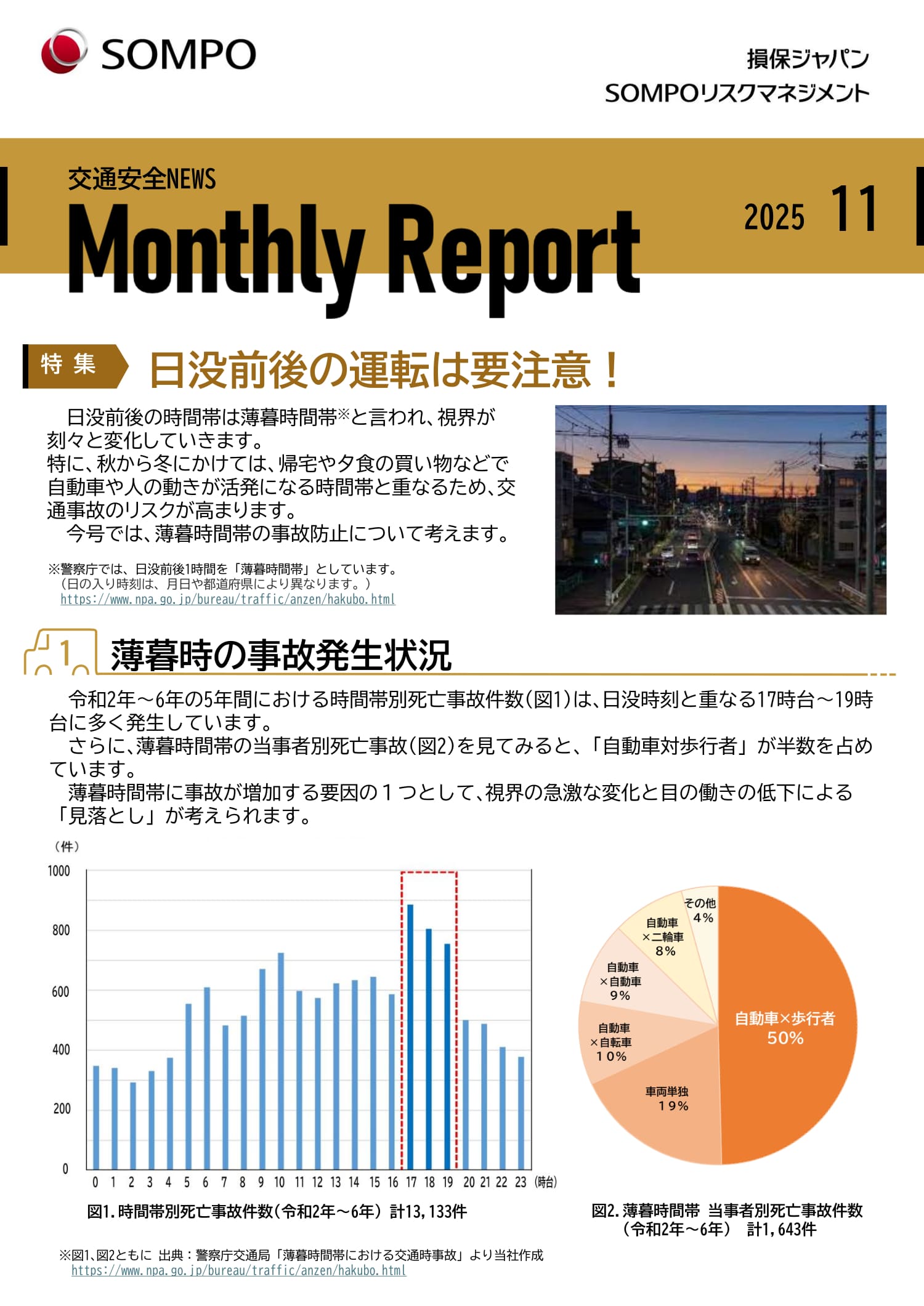 日没前後の運転は要注意!日没前後の時間帯は薄暮時間帯※と言われ、視界が刻々と変化していきます。特に、秋から冬にかけては、帰宅や夕食の買い物などで自動車や人の動きが活発になる時間帯と重なるため、交通事故のリスクが高まります。今号では、薄暮時間帯の事故防止について考えます。